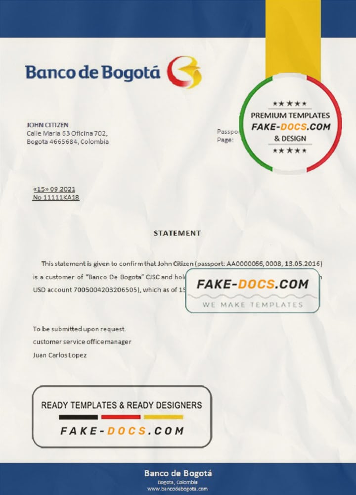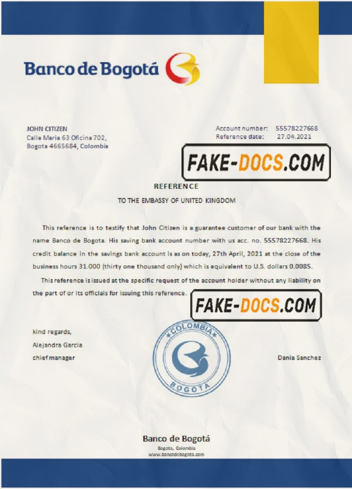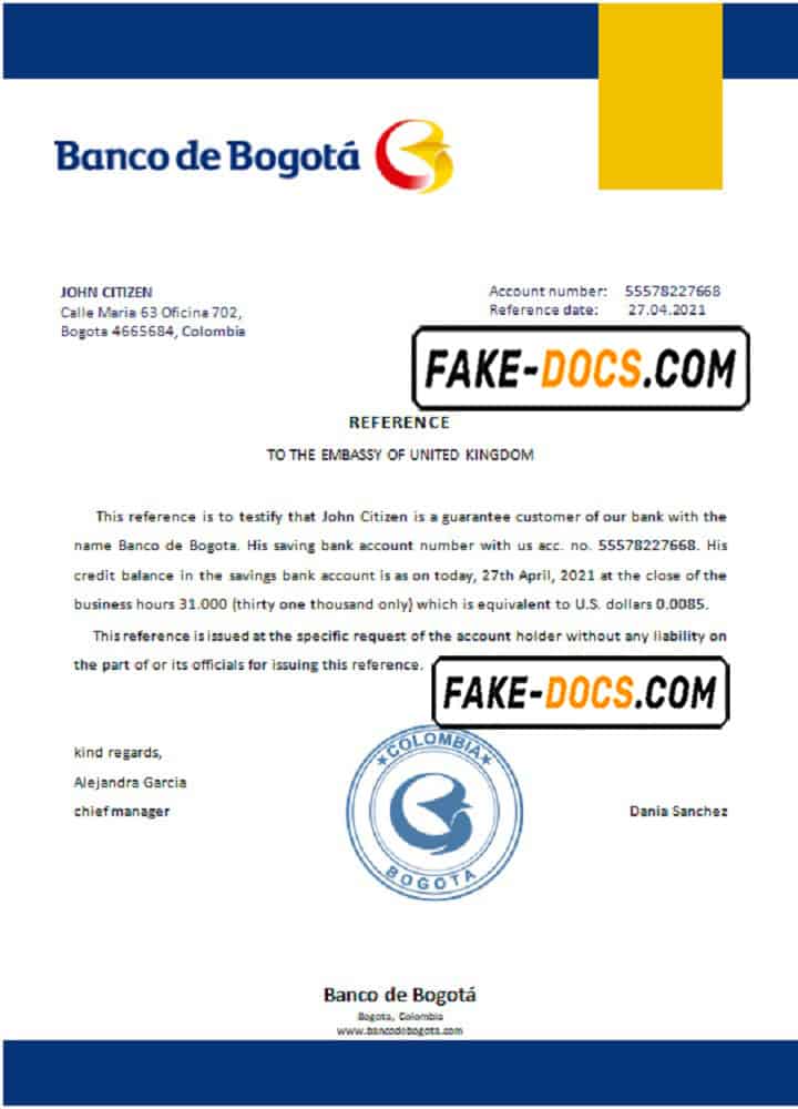 Colombia Banco de Bogotá bank account reference letter template in Word and PDF format
