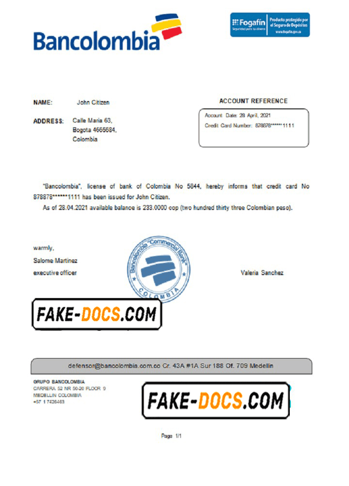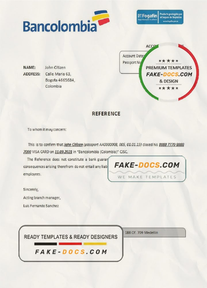 Colombia Bancolombia bank account reference letter template in Word and PDF format