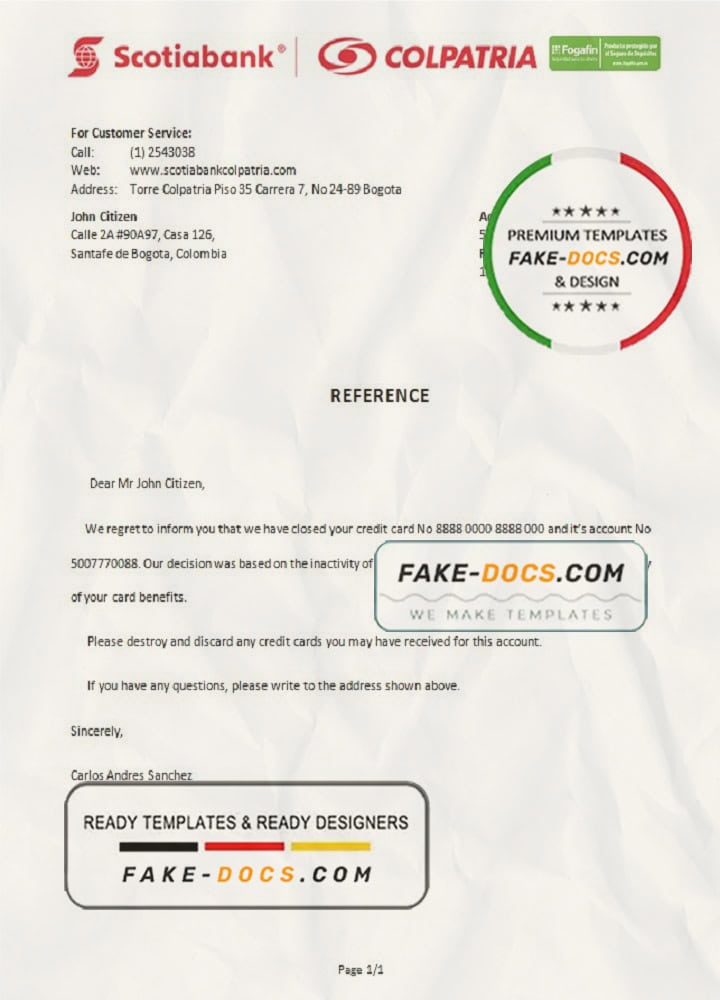 Colombia Scotiabank Colpatria bank account closure reference letter template in Word and PDF format