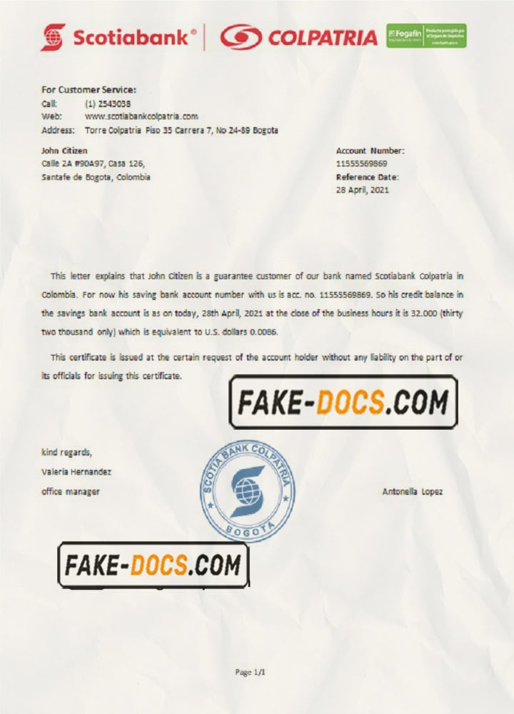 Colombia Scotiabank Colpatria bank account reference letter template in Word and PDF format