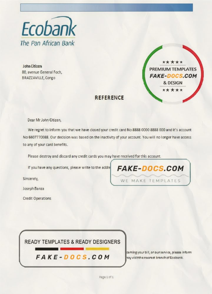 Congo Ecobank bank account closure reference letter template in Word and PDF format