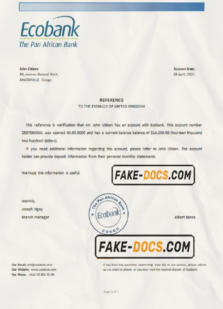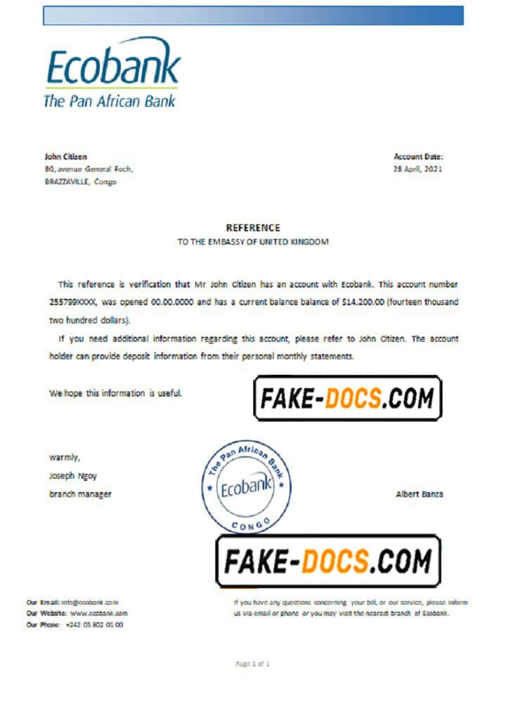Congo Ecobank bank account reference letter template in Word and PDF format