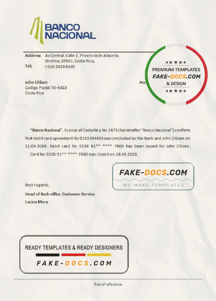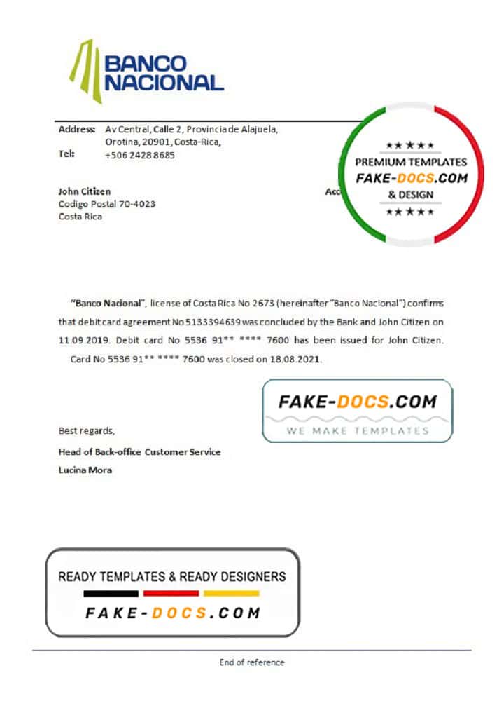 Costa Rica Banco Nacional de Costa Rica bank account closure reference letter template in Word and PDF format