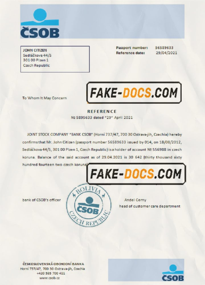 Czech Republic Československá Obchodní Banka account reference letter template in Word and PDF format