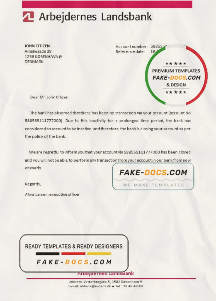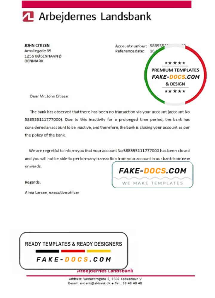 Denmark Arbejdernes Landsbank bank account closure reference letter template in Word and PDF format
