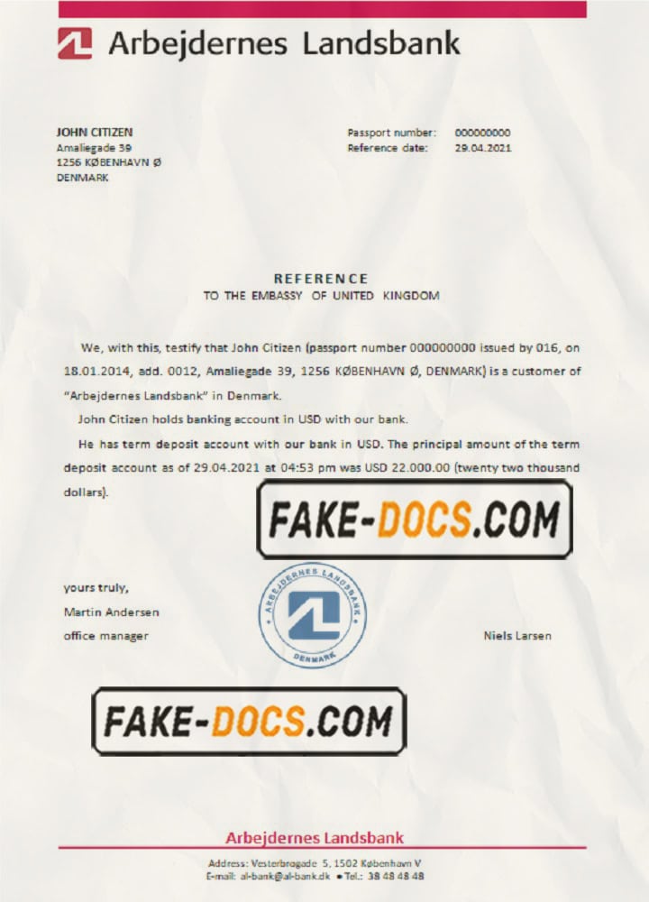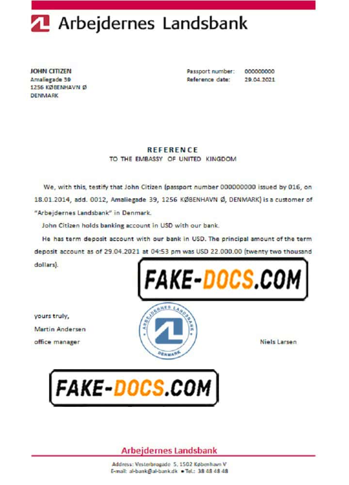Denmark Arbejdernes Landsbank bank account reference letter template in Word and PDF format