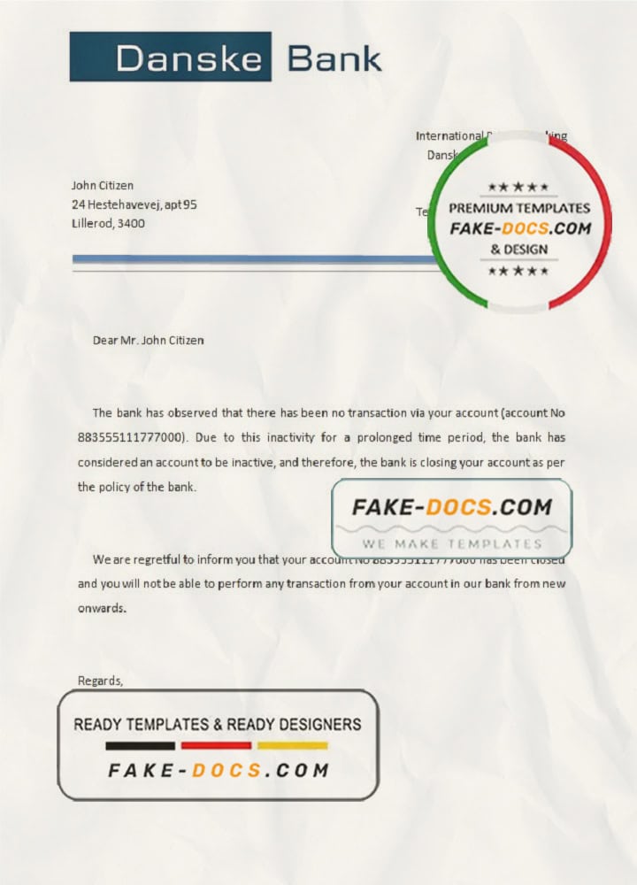 Denmark Danskebank bank account closure reference letter template in Word and PDF format