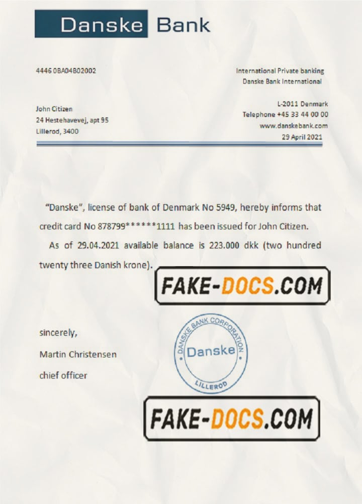 Denmark Danskebank bank account reference letter template in Word and PDF format