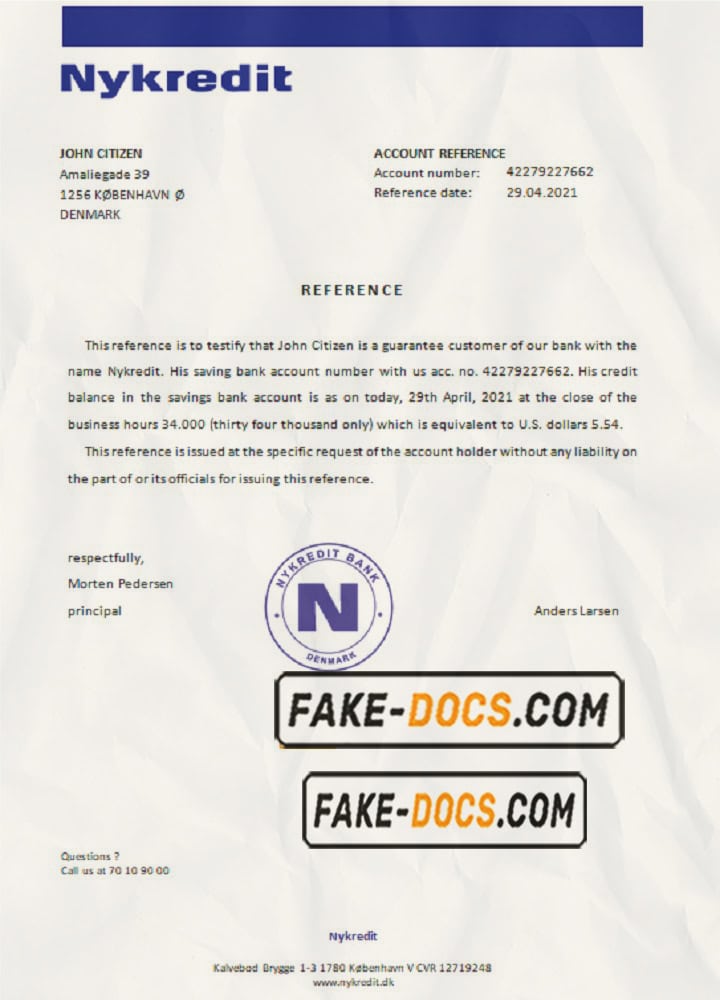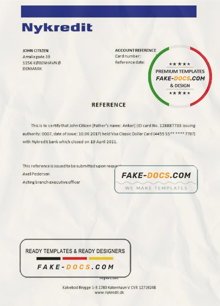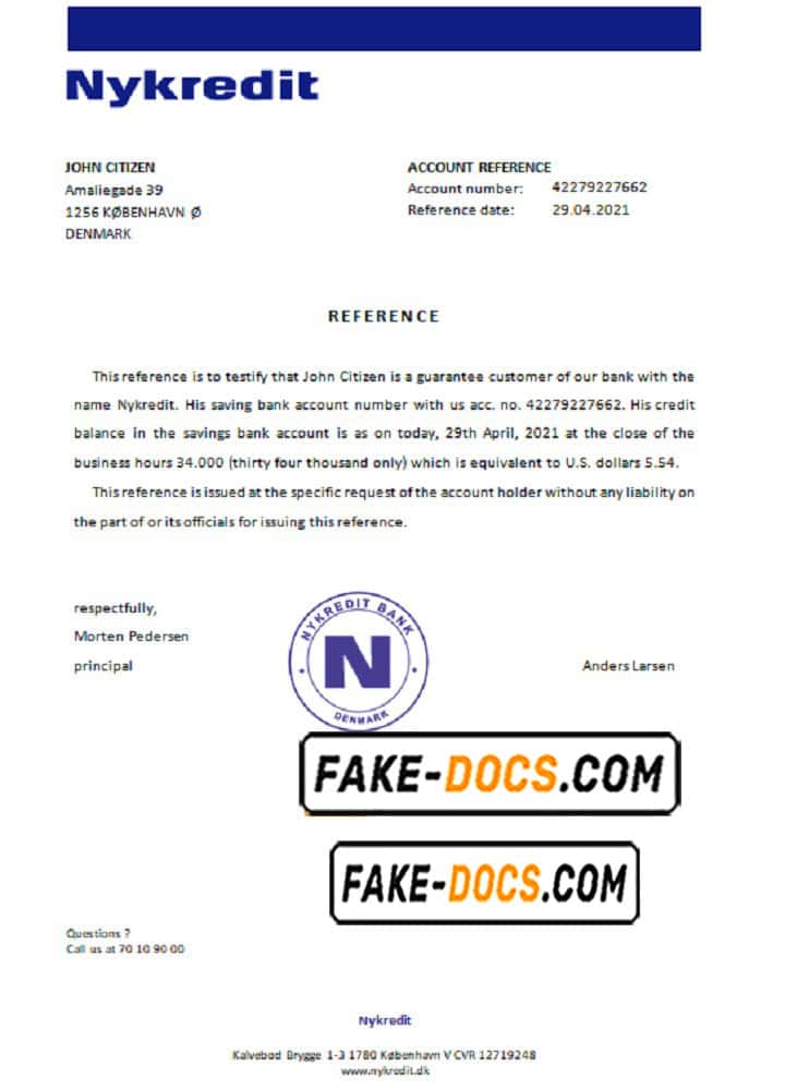 Denmark Nykredit bank account reference letter template in Word and PDF format