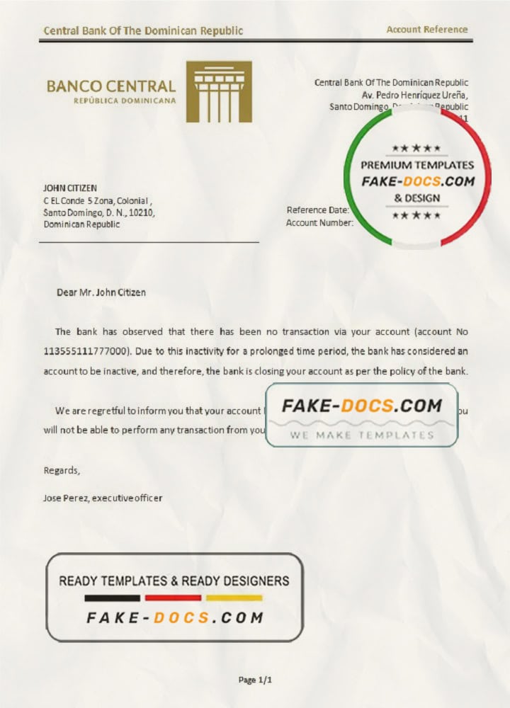 Dominica Central Bank Of The Dominican Republic bank account closure reference letter template in Word and PDF format