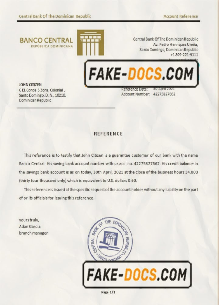 Dominica Central Bank Of The Dominican Republic bank account balance reference letter template in Word and PDF format