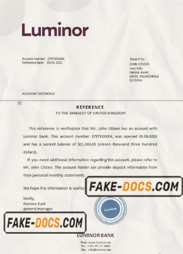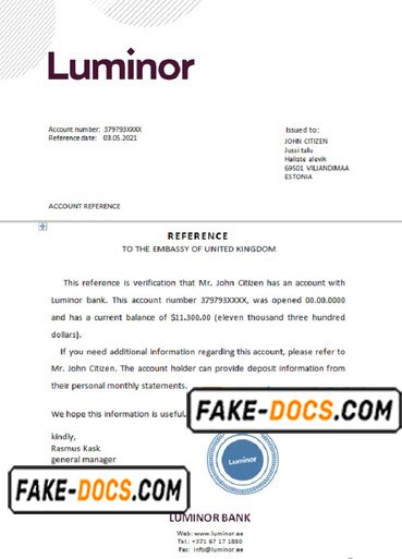 Estonia Luminor Bank template of bank reference letter, Word and PDF format (.doc and .pdf)