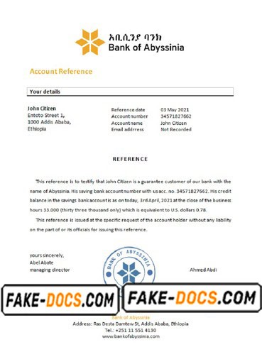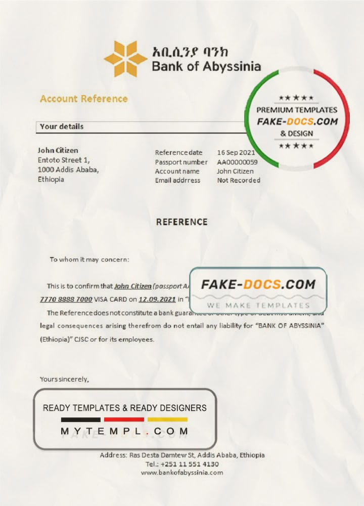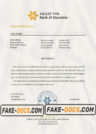 Ethiopia Bank of Abyssinia bank reference letter, Word and PDF format (.doc and .pdf)