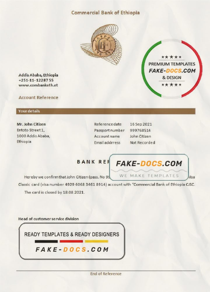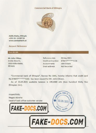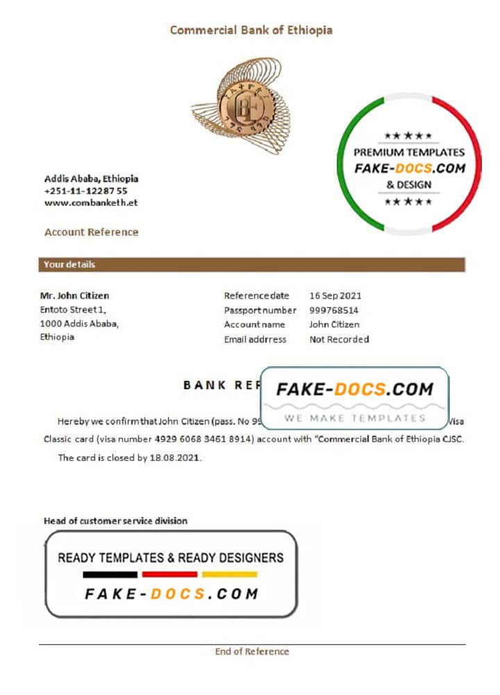 Ethiopia Commercial Bank bank reference letter, Word and PDF format (.doc and .pdf)