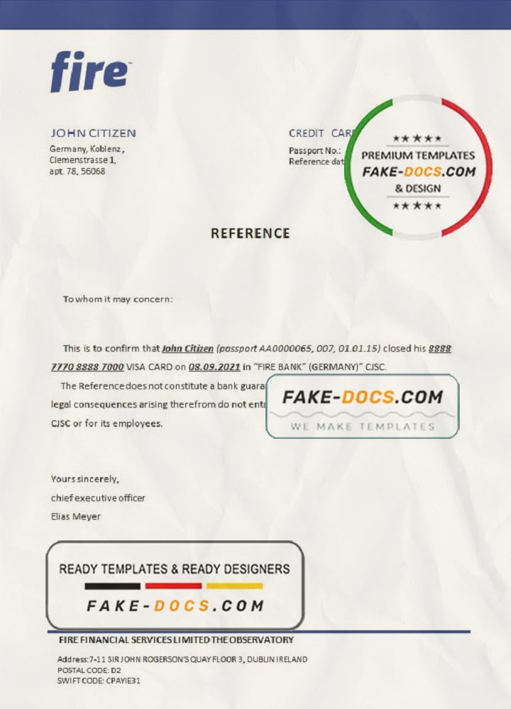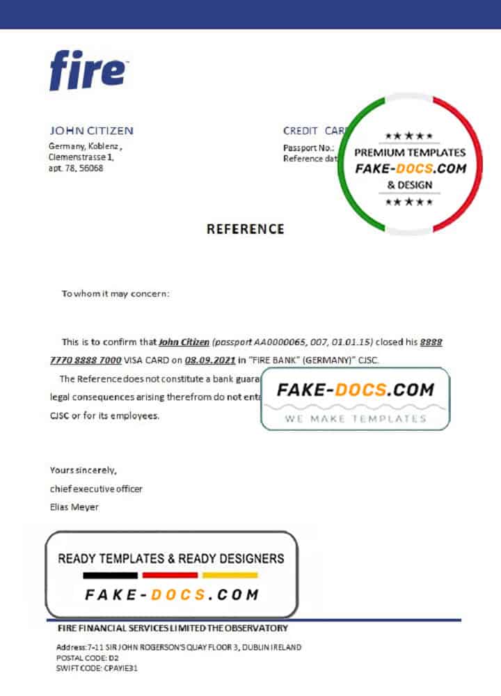 Germany Fire bank account closure reference letter template in Word and PDF format