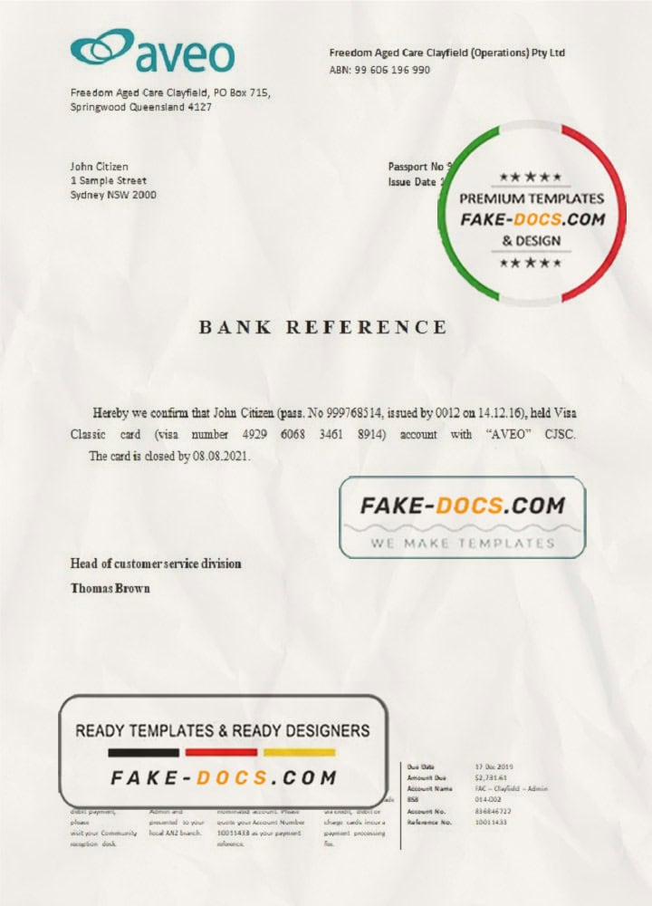 Australia Aveo bank account closure reference letter template in Word and PDF format