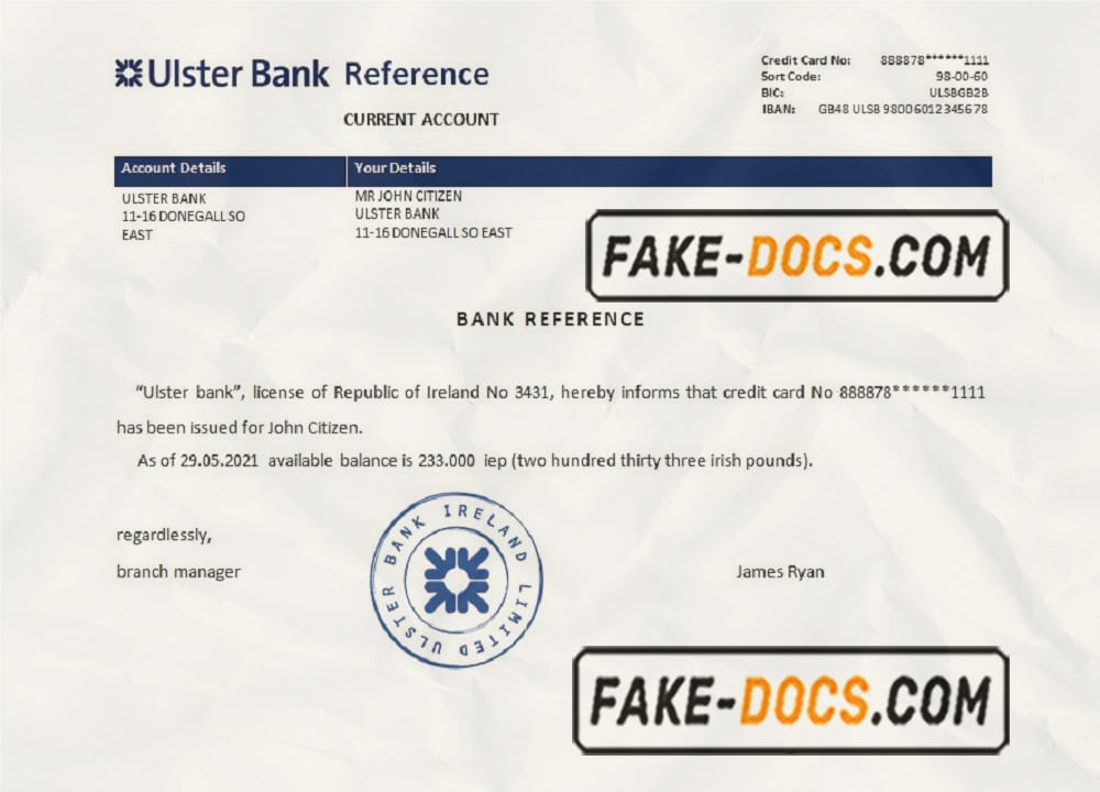 Ireland Ulster Bank bank account reference letter template in Word and PDF format