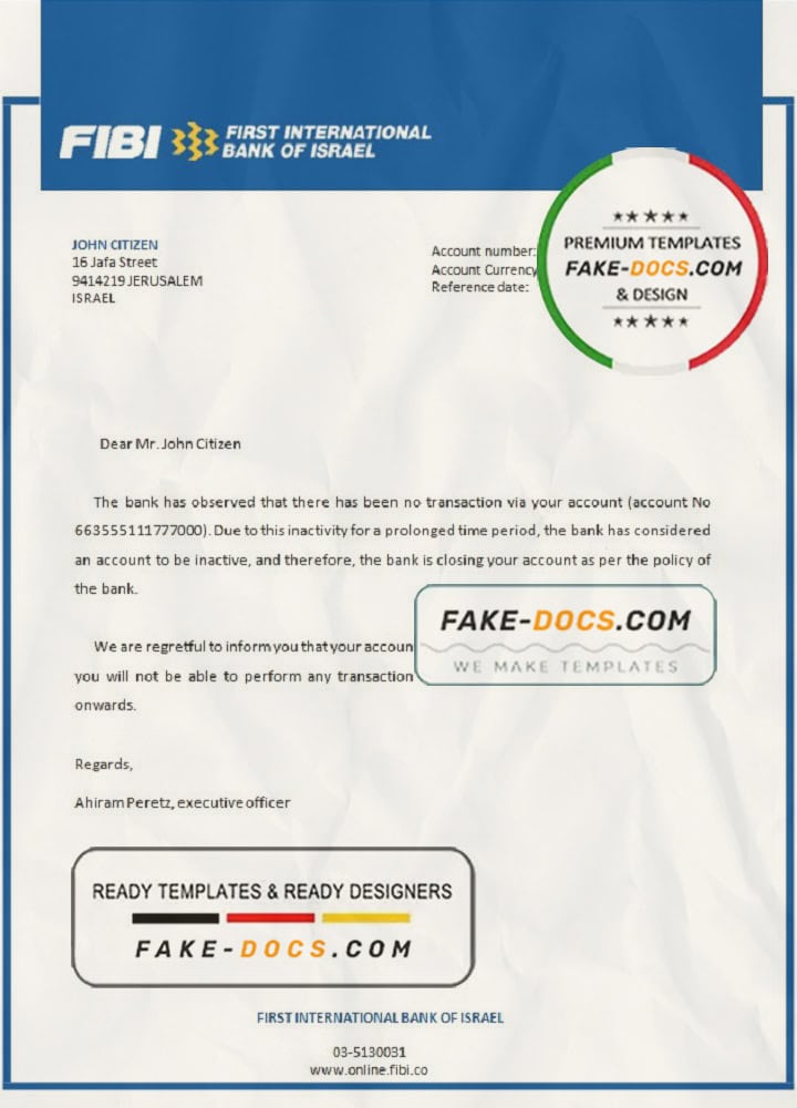 Israel First International Bank of Israel bank account closure reference letter template in Word and PDF format