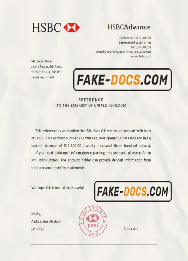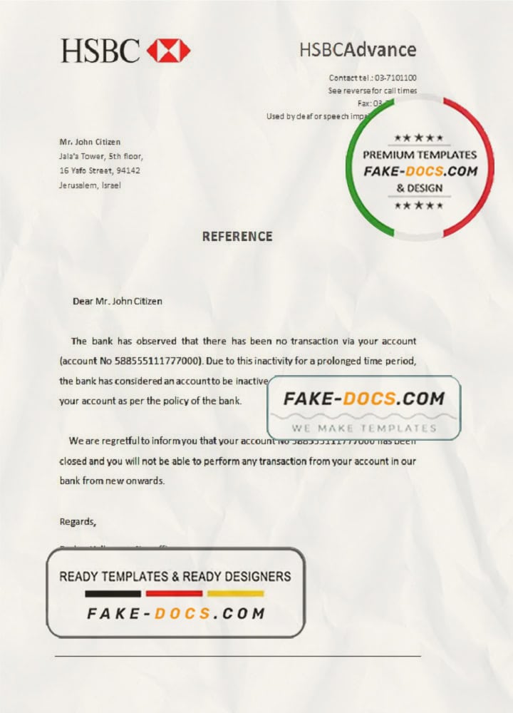 Israel HSBC bank account closure reference letter template in Word and PDF format