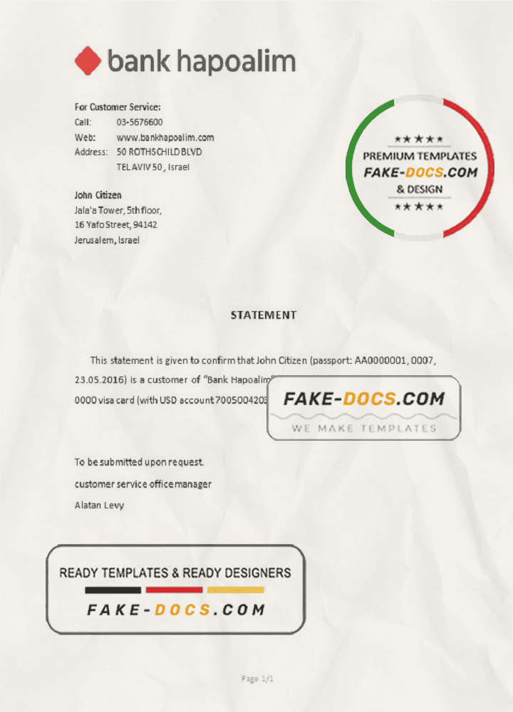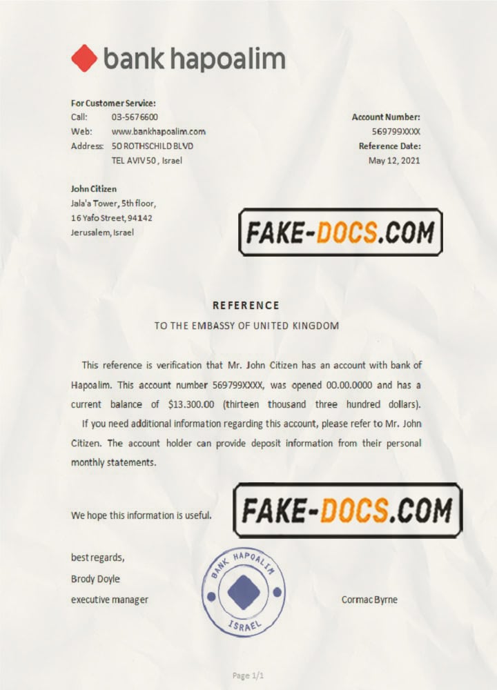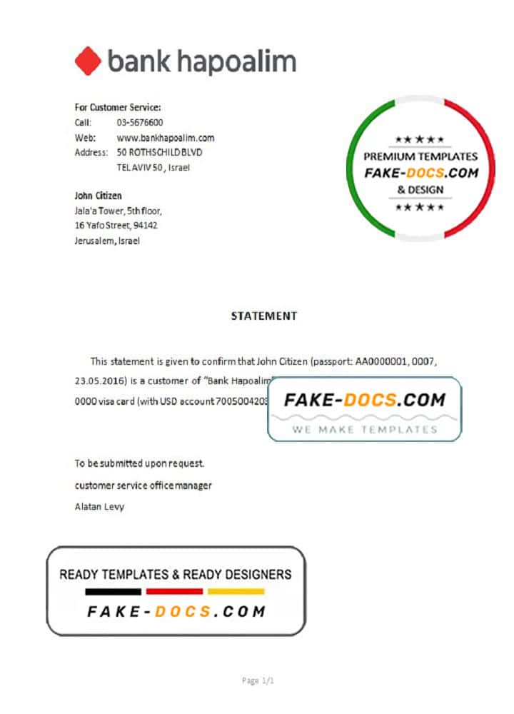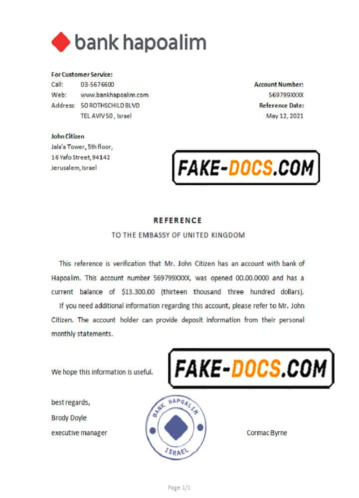 Israel Hapoalim bank account reference letter template in Word and PDF format