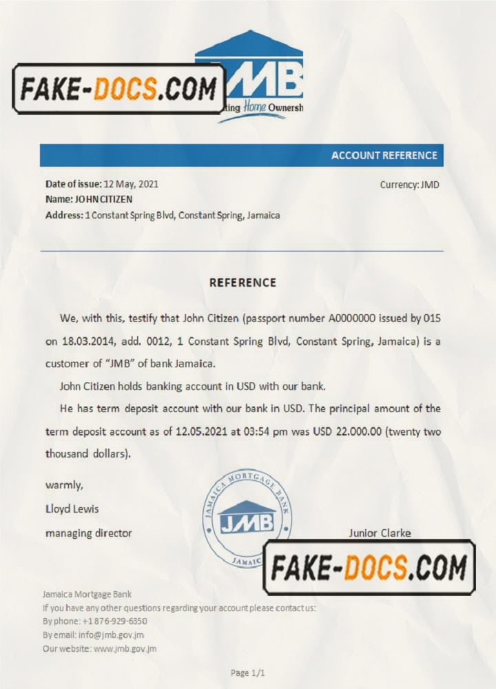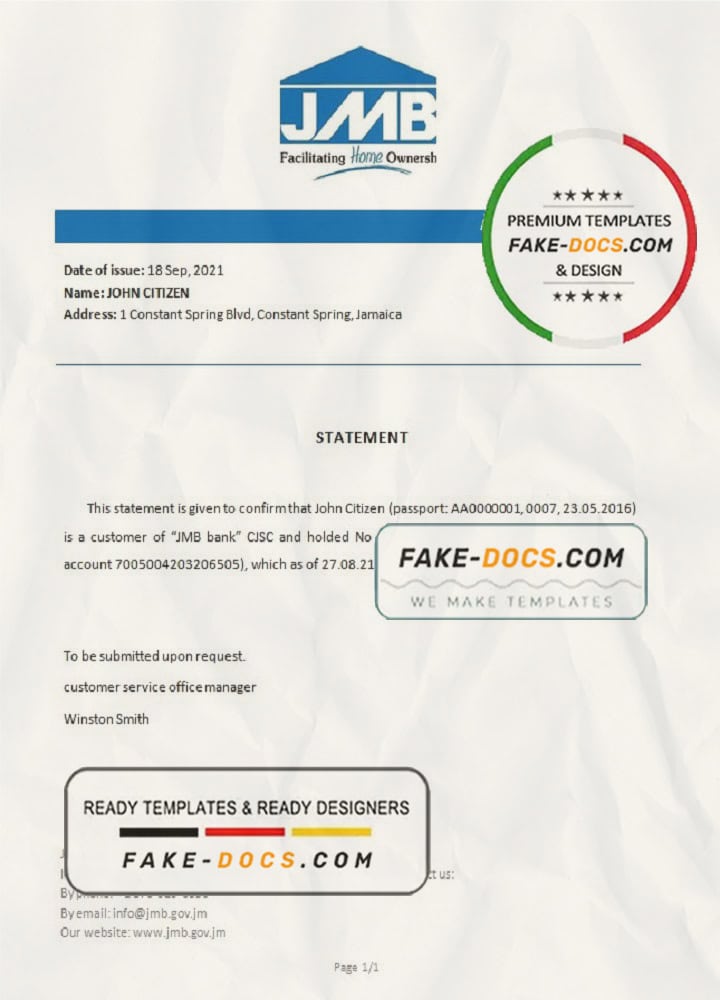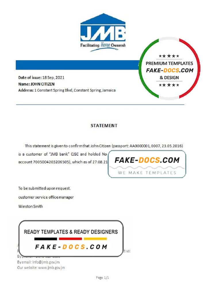 Jamaica Mortgage bank account reference letter template in Word and PDF format