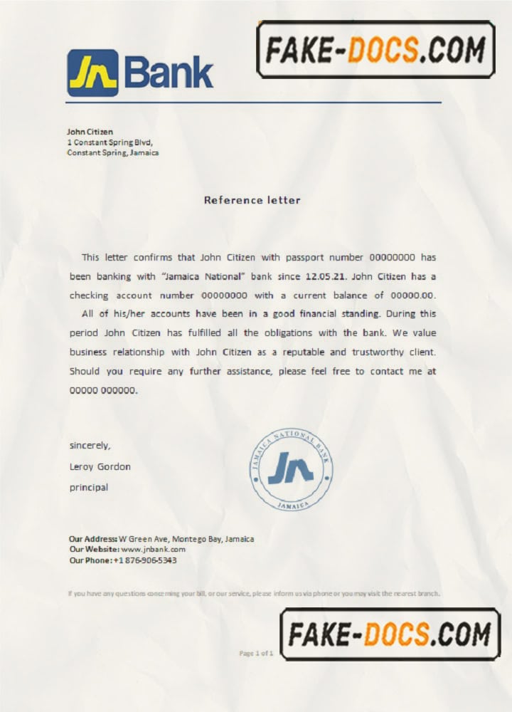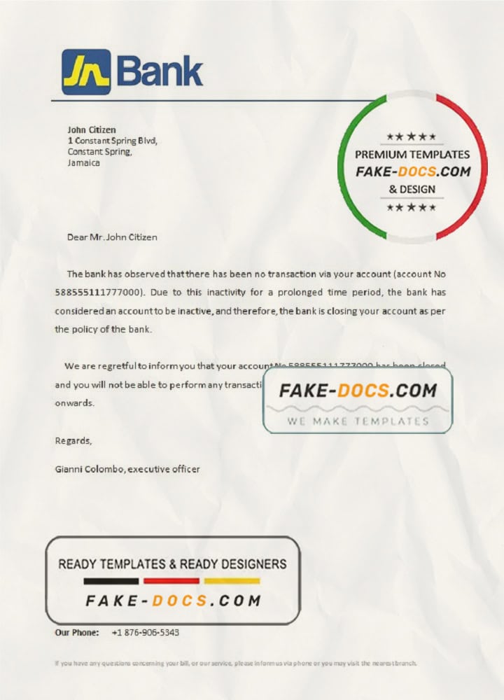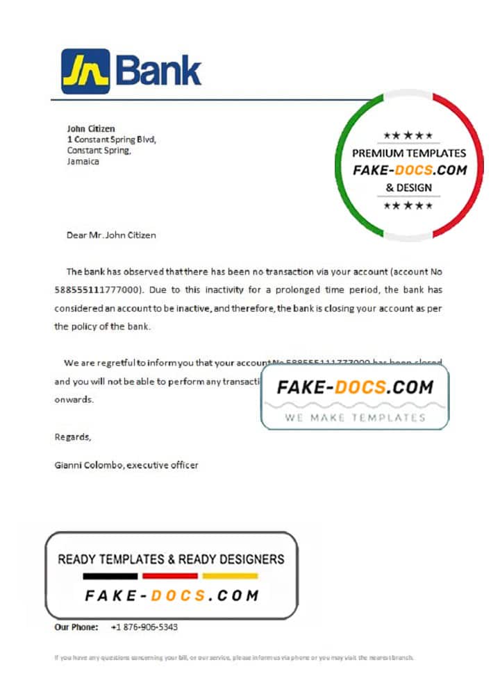 Jamaica National bank account closure reference letter template in Word and PDF format