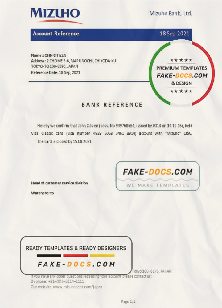 Japan Mizuho bank account closure reference letter template in Word and PDF format
