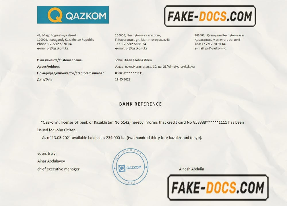Kazakhstan Qazkom bank account reference letter template in Word and PDF format