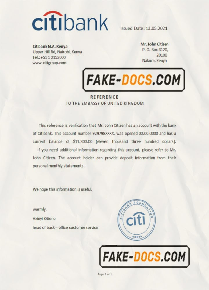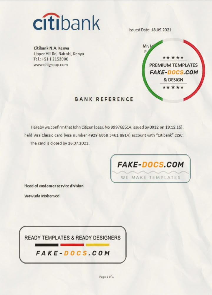 Kenya Citibank account closure reference letter template in Word and PDF format