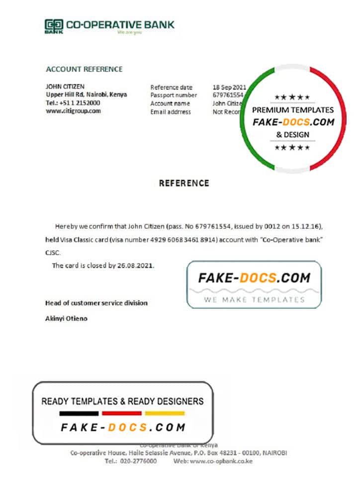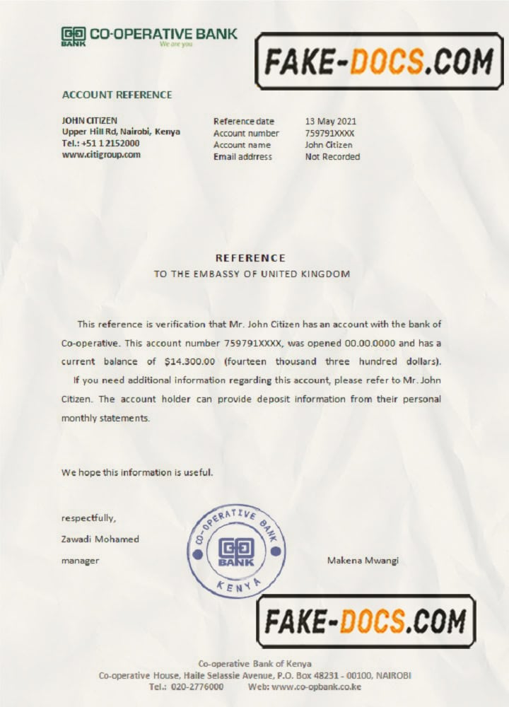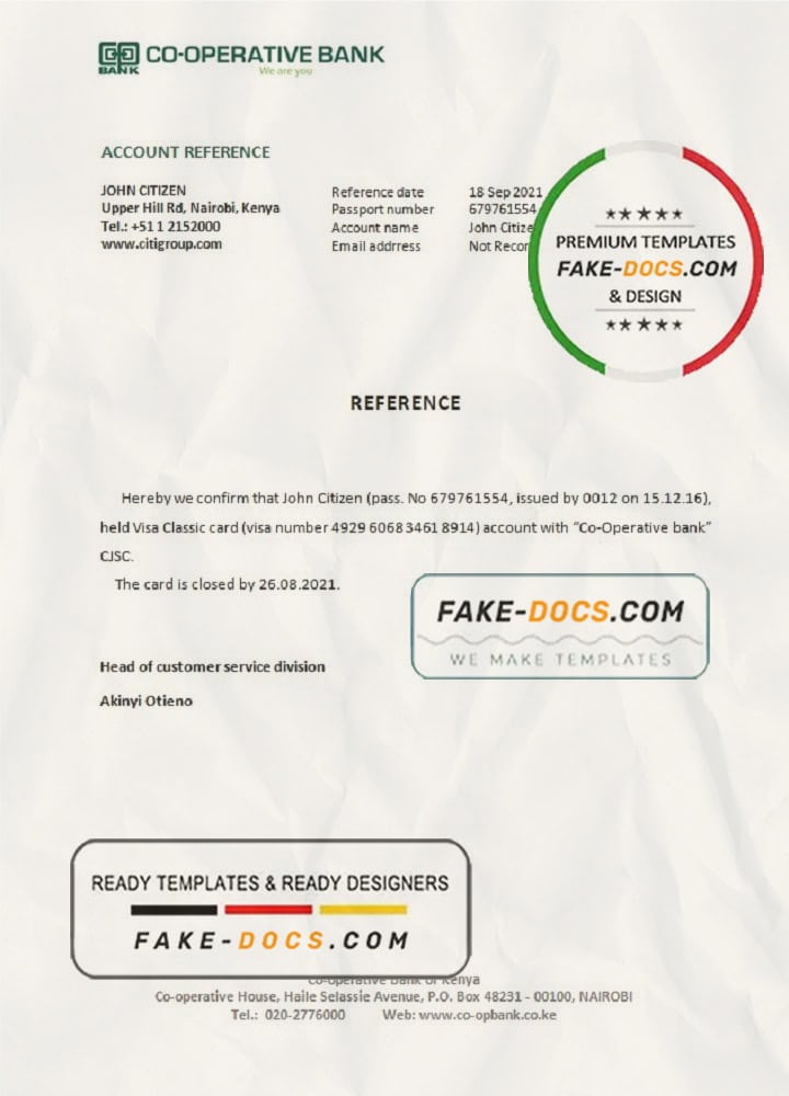 Kenya Co-operative bank account reference letter template in Word and PDF format