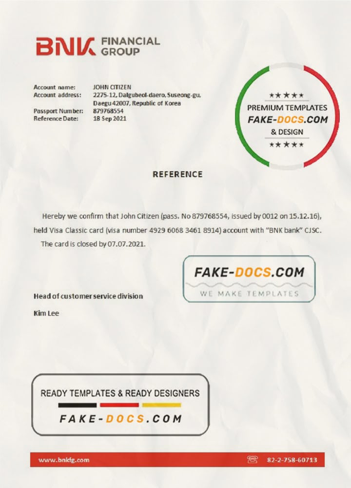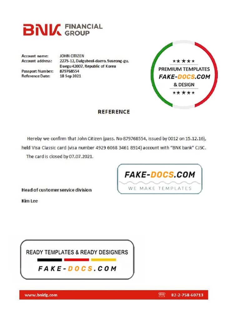 Korea BNK bank account closure reference letter template in Word and PDF format