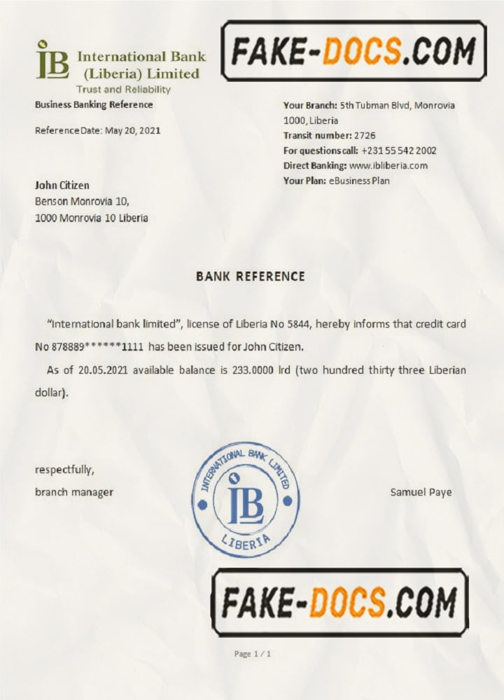 Liberia International Bank Limited bank reference letter template in Word and PDF format