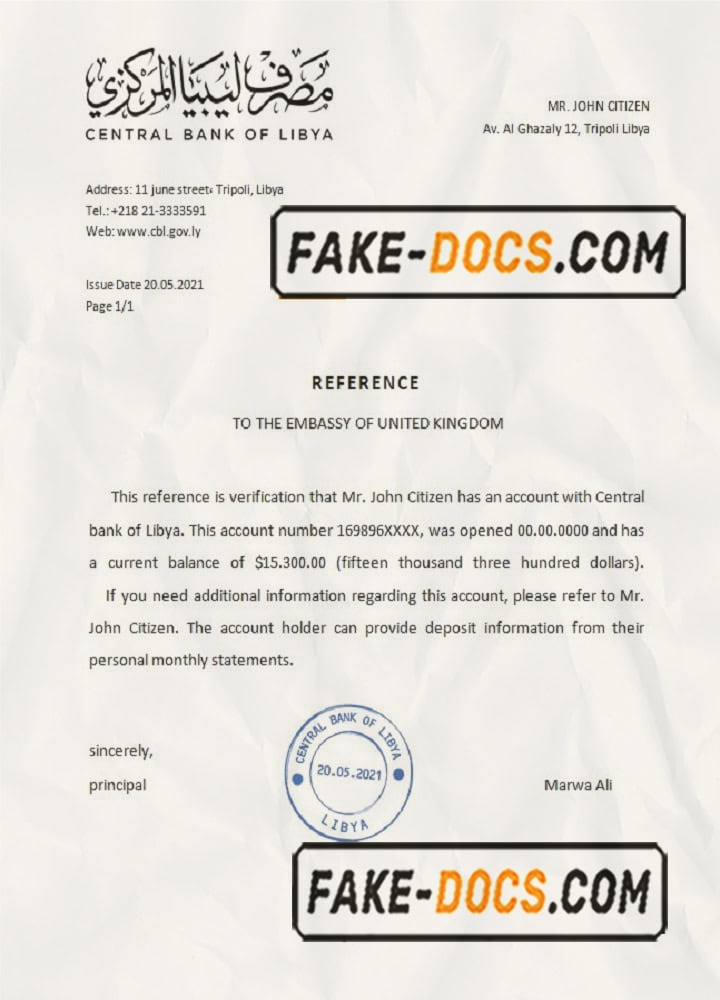 Libya Central Bank of Libya bank reference letter template in Word and PDF format