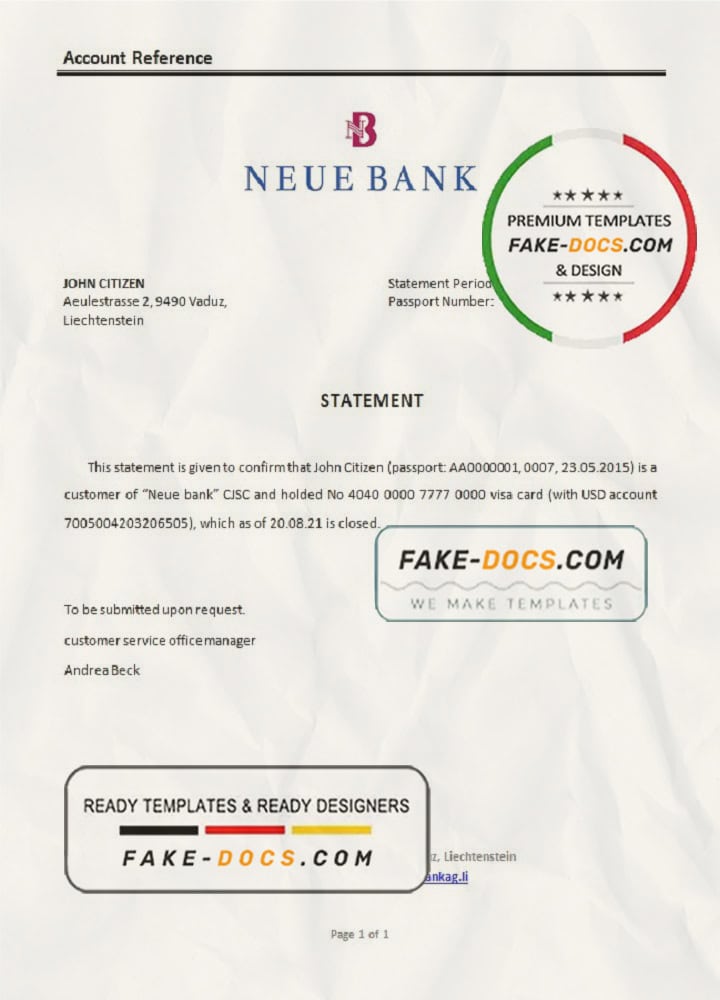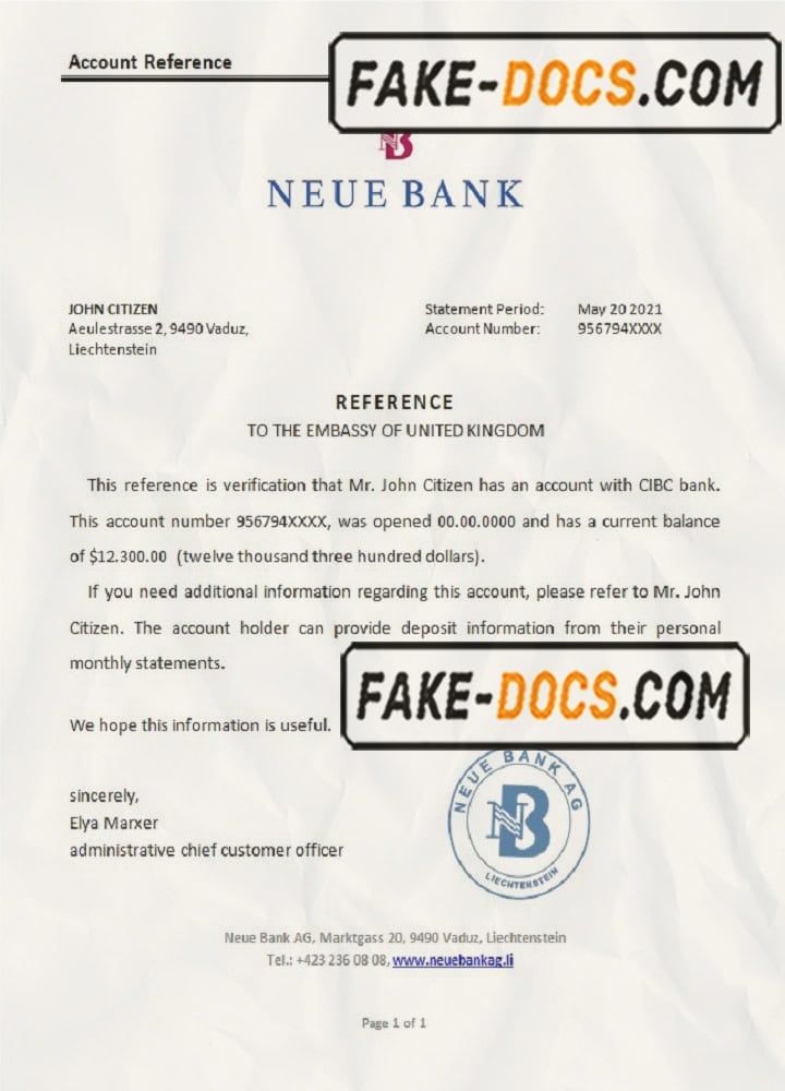Liechtenstein Neue Bank bank reference letter template in Word and PDF format