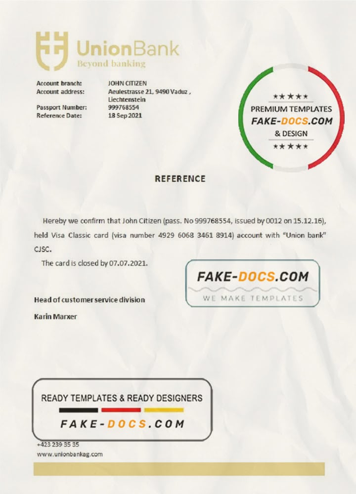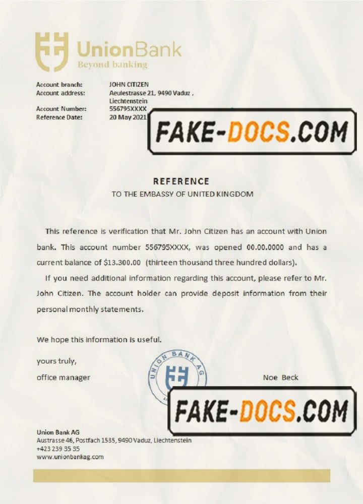 Liechtenstein Union Bank bank reference letter template in Word and PDF format