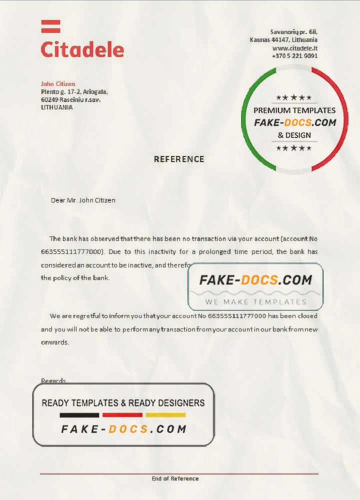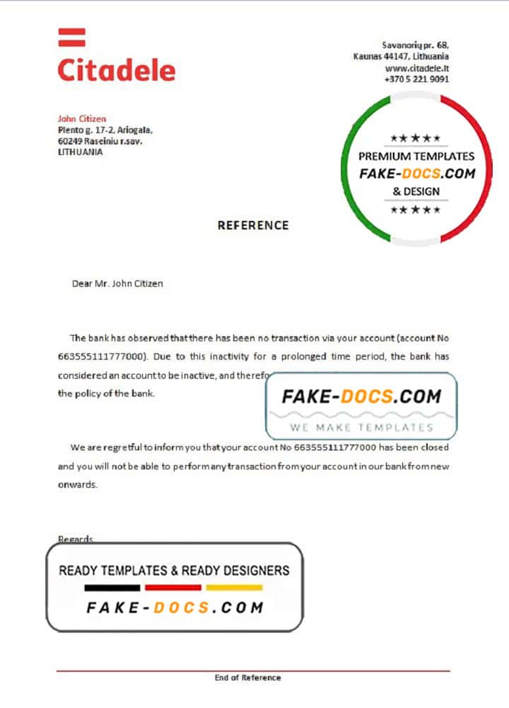 Lithuania Citadele bank account closure reference letter template in Word and PDF format