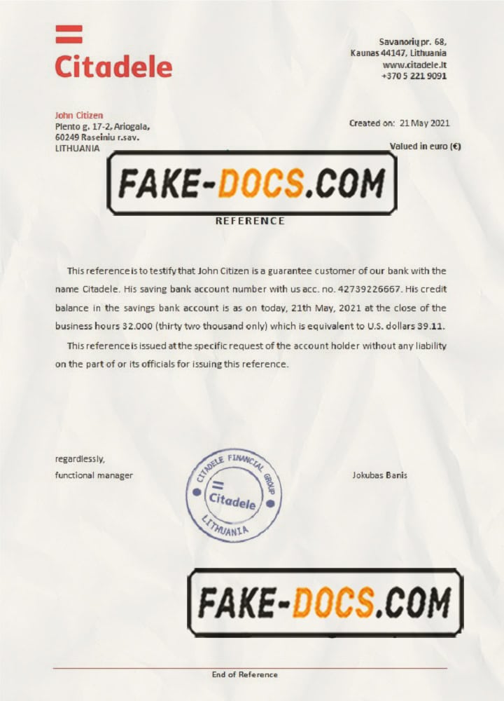Lithuania Citadele bank reference letter template in Word and PDF format