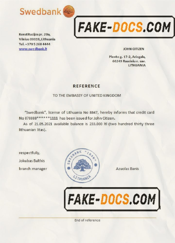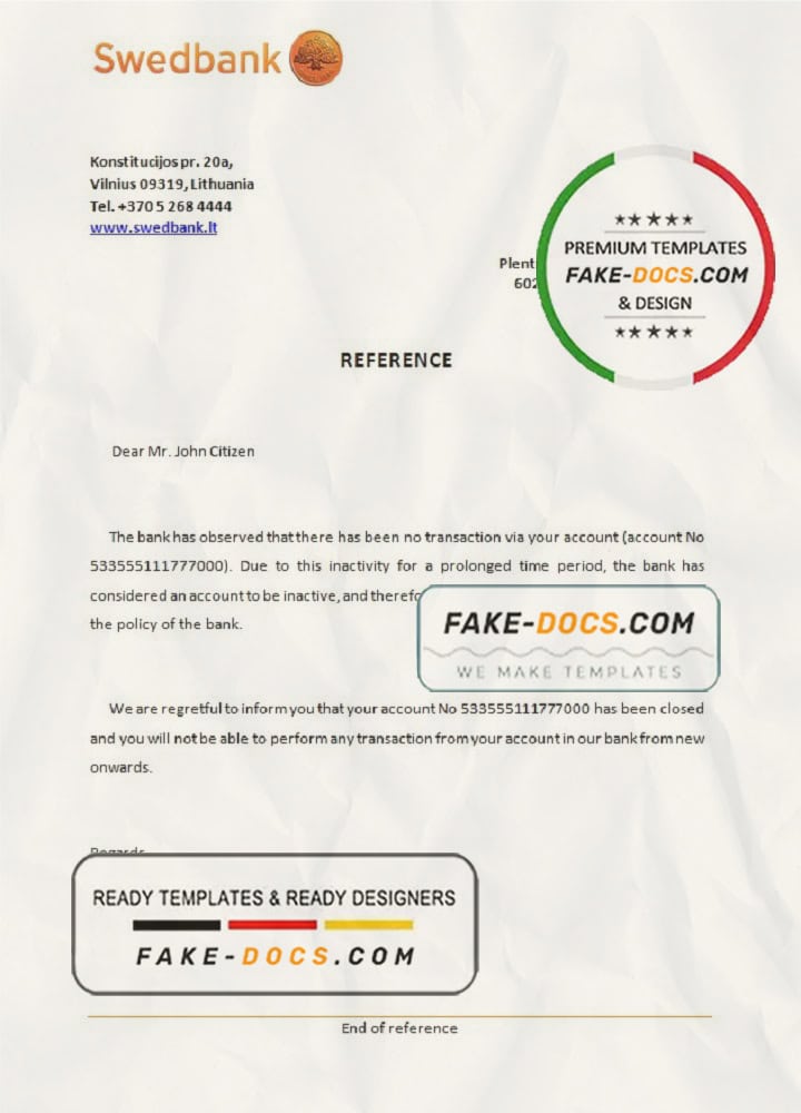 Lithuania Swedbank bank reference letter template in Word and PDF format