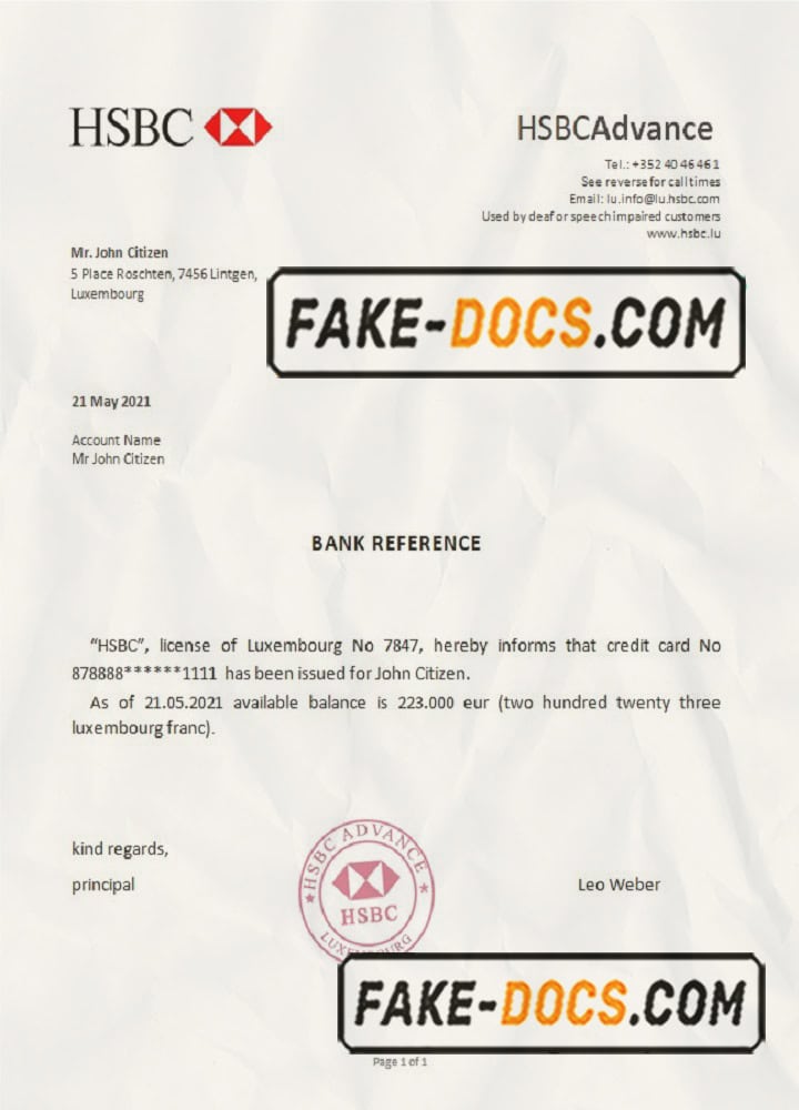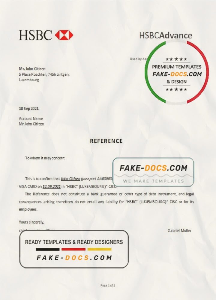 Luxembourg HSBC bank reference letter template in Word and PDF format