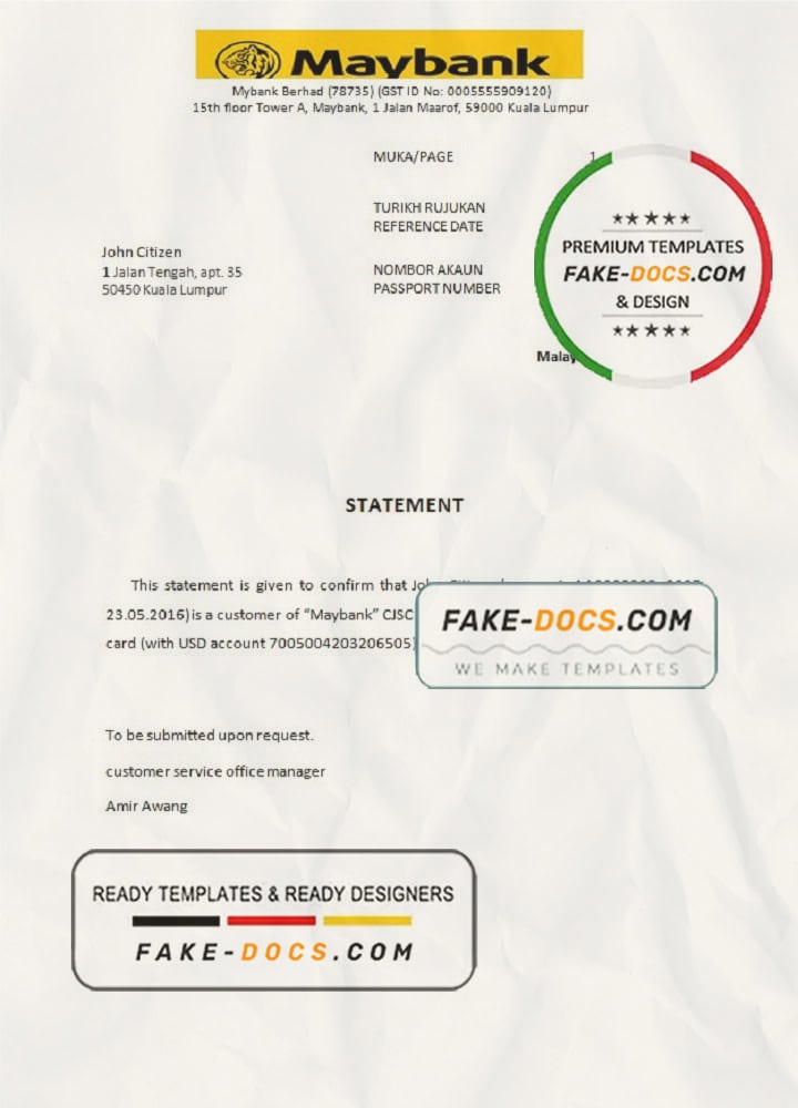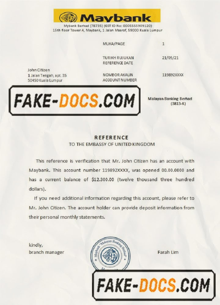 Malaysia Maybank bank reference letter template in Word and PDF format