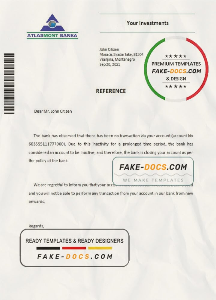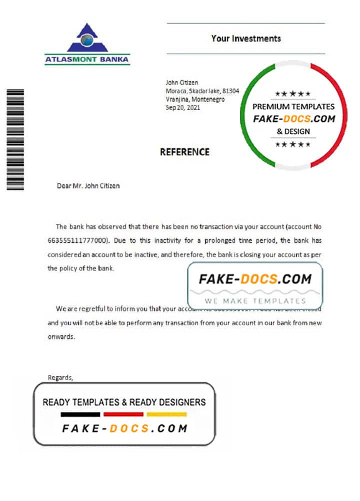 Montenegro Atlasmont banka bank account closure reference letter template in Word and PDF format