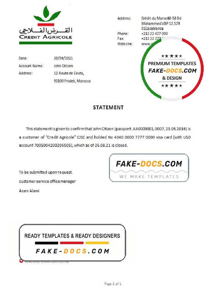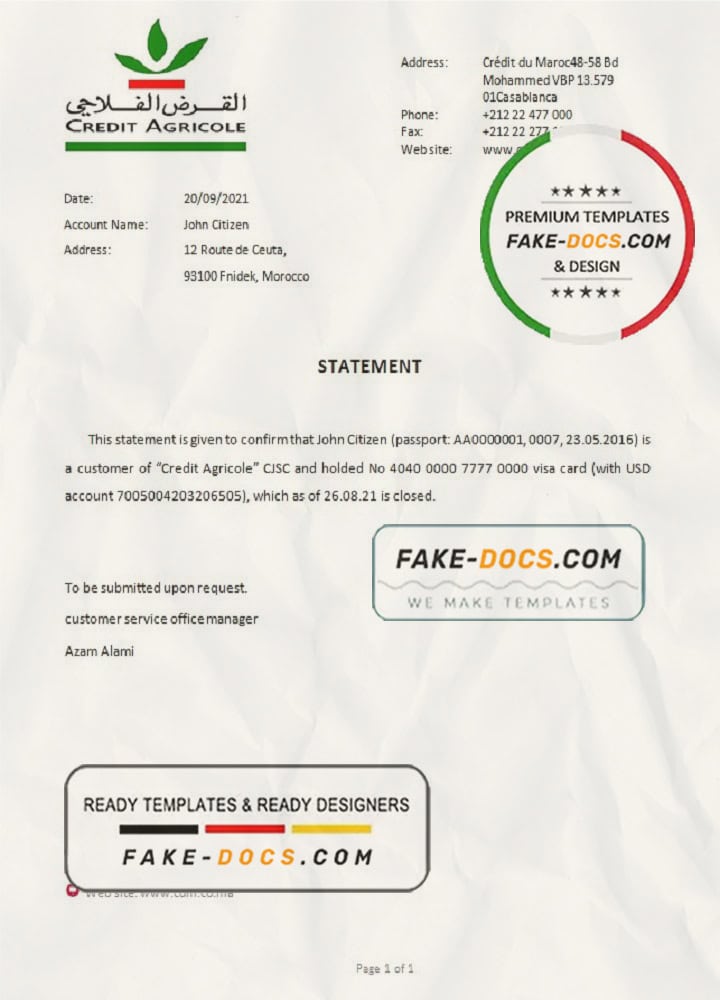 Morocco Credit Agricole bank account closure reference letter template in Word and PDF format