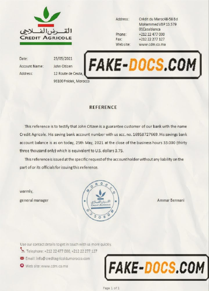 Morocco Credit Agricole bank reference letter template in Word and PDF format