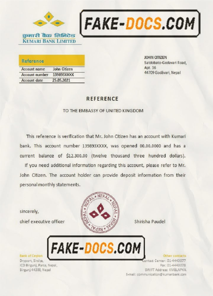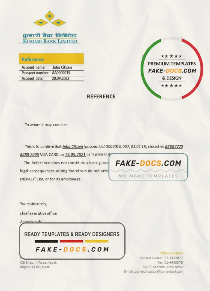 Nepal Kumari Bank bank reference letter template in Word and PDF format
