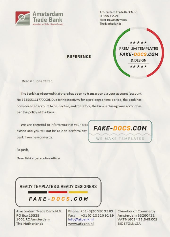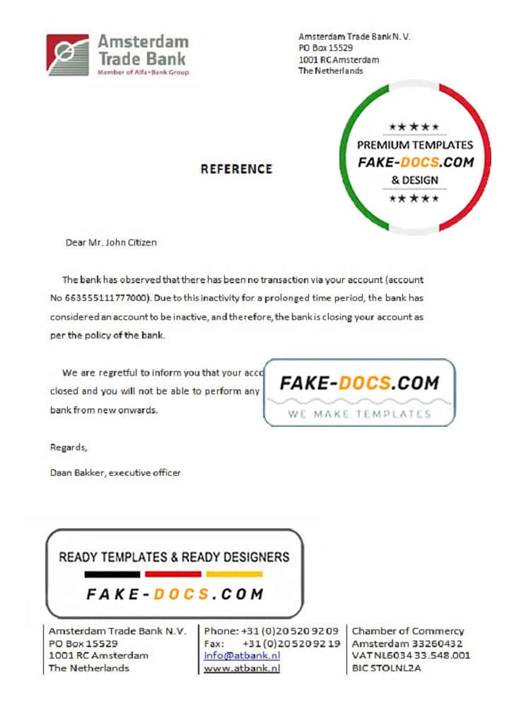 Netherlands Amsterdam Trade Bank account closure certificate template in Word and PDF format