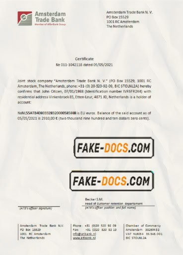Netherlands Amsterdam Trade Bank certificate template in Word and PDF format