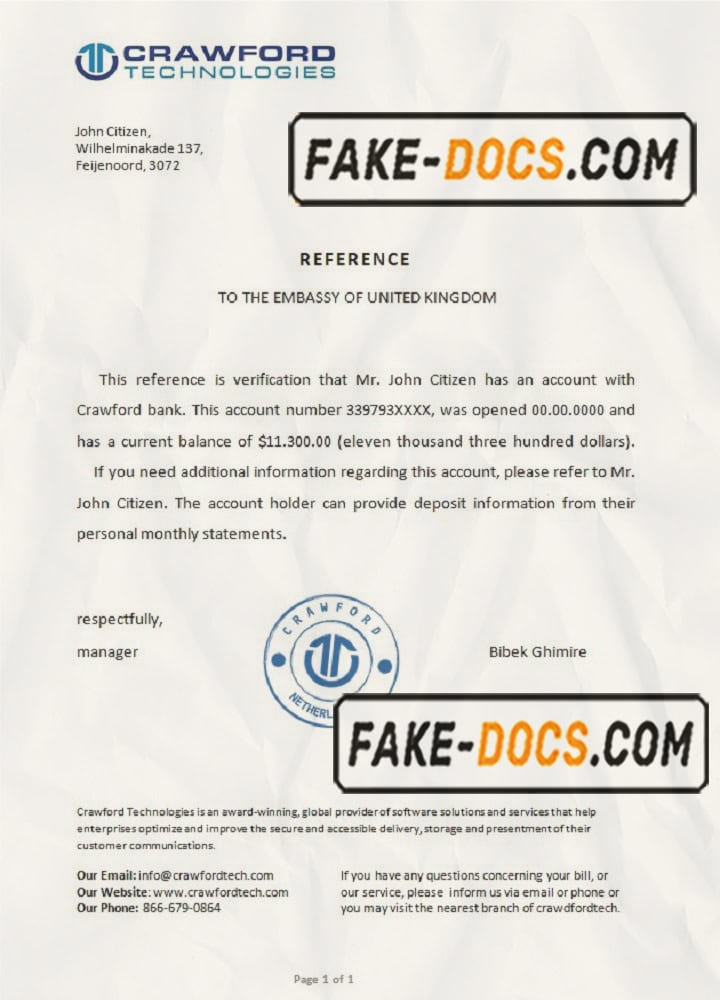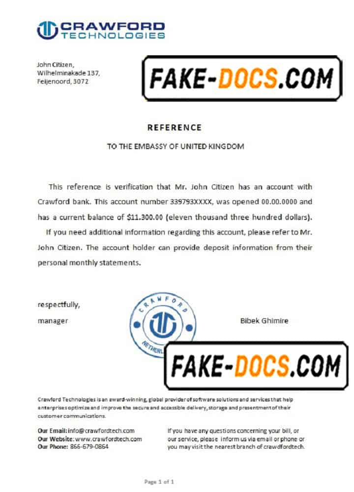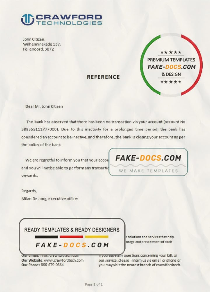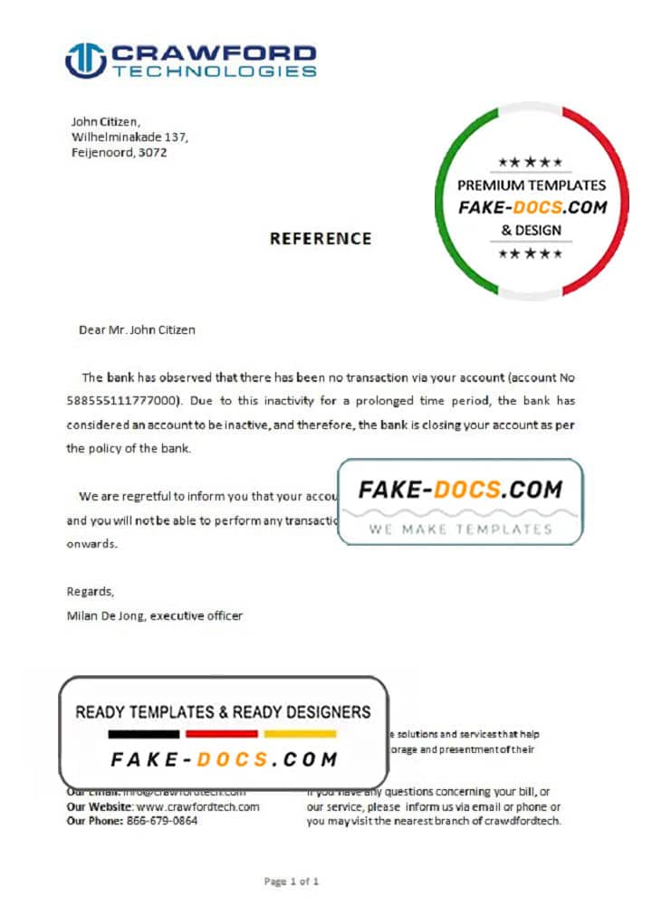 Netherlands Crawford bank account closure certificate template in Word and PDF format