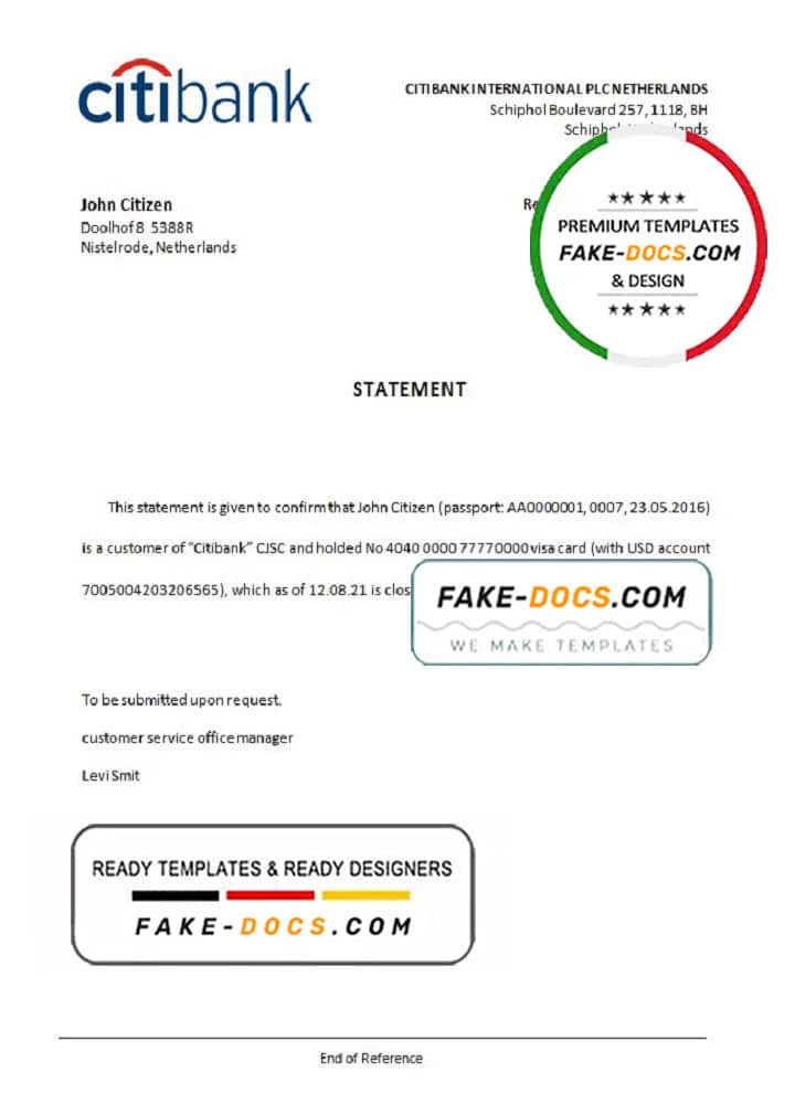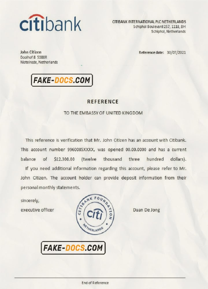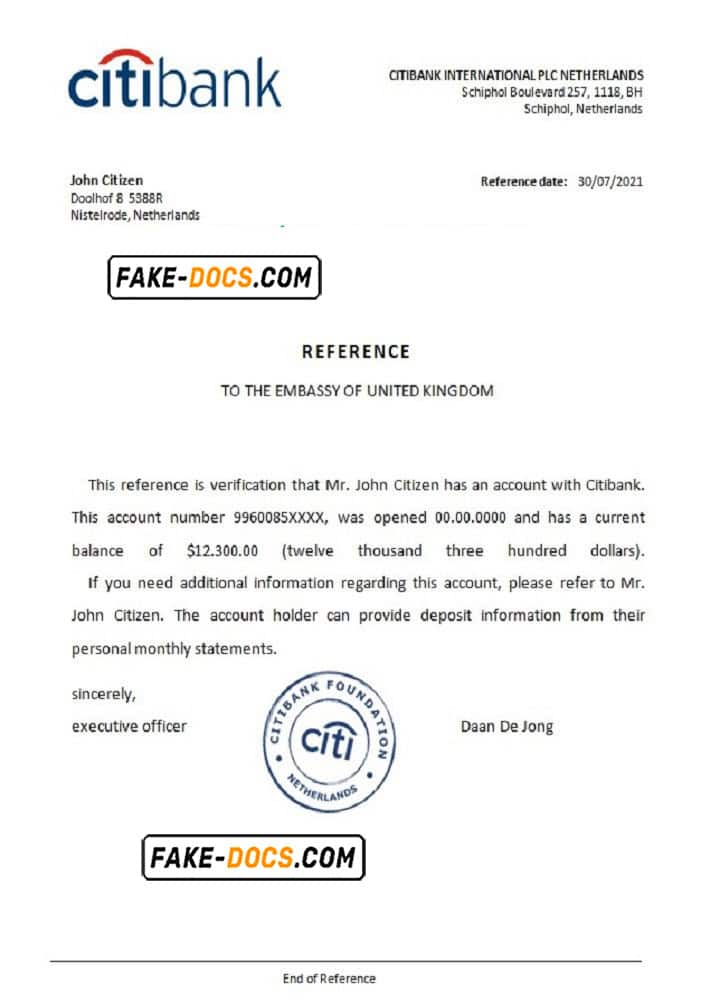 Netherlands Citibank account balance certificate template in Word and PDF format