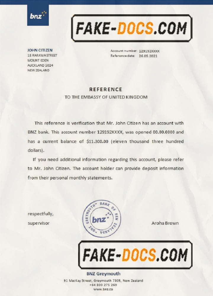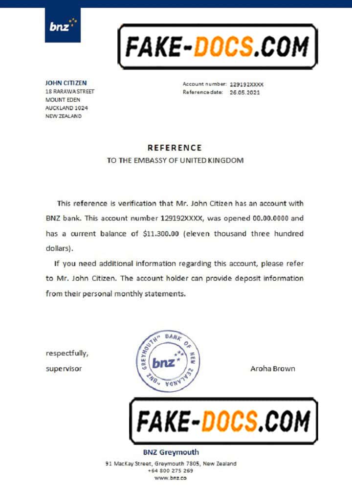 New Zealand BNZ bank account reference letter template in Word and PDF format