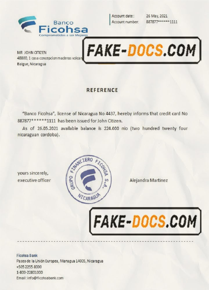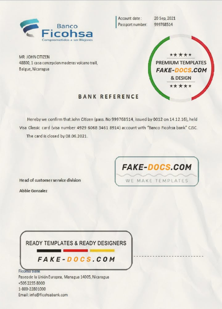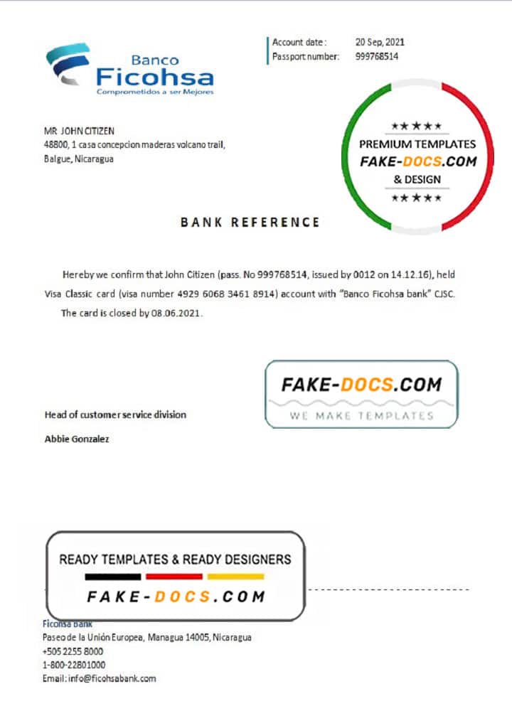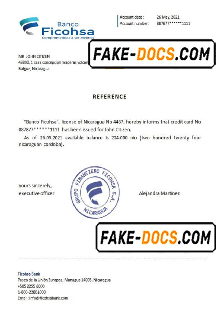 Nicaragua Banco Ficohsa bank account reference letter template in Word and PDF format